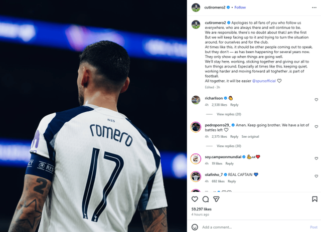 가뜩이나 팀 분위기가 좋지 않은 상황에서 중심을 잡아야 할 로메로가 구단 고위 관계자들을 겨냥하는 글을 쓴 것을 본 토트넘 팬들은 크게 분노했다. 팬들은 구단이 자체적으로 로메로에게 징계를 내리고, 최악의 경우 로메로의 주장직을 박탈할 수도 있을 거라고 예상했다.