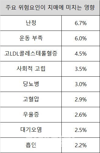 분석 결과 난청이 6.7%로 치매 발병에 가장 큰 영향을 미치는 것으로 나타났다. 노화성 난청 환자 전원이 보청기를 착용해 청력을 개선하면 치매 환자가 6%가량 줄어든다는 계산이다. 운동부족(6.0%), 고LDL콜레스테롤혈증(4.5%)이 뒤를 이었다.