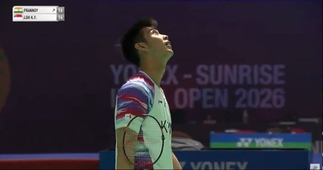 15일(한국시간) 인도 뉴델리 인디라 간디 스포츠 콤플렉스에서 열린 HS 프란노이(인도)와 로컨유(싱가포르)의 세계배드민턴연맹(BWF) 인도 오픈(슈퍼 750) 남자 단식 16강 1게임 도중, 경기가 중단됐다.