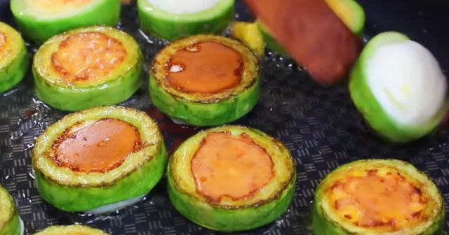 프라이팬에는 기름을 넉넉하지 않게 두르고 중약불로 달군다. 애호박은 수분이 많은 채소라 센 불에서 조리하면 겉만 타고 속은 덜 익기 쉽다. 팬이 달궈지면 애호박을 먼저 올리고, 구멍 난 부분에 계란물을 숟가락으로 천천히 부어준다. 이때 불을 낮추고 뚜껑을 덮어주면 애호박이 골고루 익으면서 계란도 부드럽게 익는다. 한쪽 면이 익으면 조심스럽게 뒤집어 반대쪽도 색을 낸다.