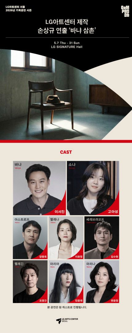 LG아트센터는 오는 5월 7~31일 서울 강동구 LG아트센터 LG시그니처홀에서 공연하는 연극 ‘바냐 삼촌’의 캐스팅을 12일 공개했다.