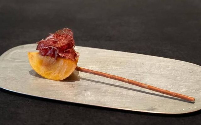 제주 홍차를 우린 물에 가볍게 데쳐 껍질과 고기에 차의 쌉싸래한 향과 맛을 은은히 덧입히며 10일간 숙성시킨다. 중국을 여행하면서 봤던, 바람 앞에서 식재료를 말리는 기술은 겉은 바삭하고 속은 쫄깃하게 만든다. 숙성 오리의 향과 맛이 부담스럽지 않도록 한라봉을 곁들여 산미와 단맛을 더하고, 마라탕을 연상시키는 산초 열매와 향긋한 장미 장아찌를 올려 완성한다.