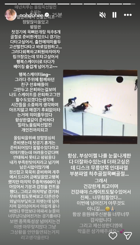 노도희는 22일 자신의 SNS를 통해 2014 소치 동계올림픽 선발전부터 이번 밀라노·코르티나 올림픽 선발전까지의 여정, 그리고 숱한 부상 경력, 이번 대회에서 일어난 일들을 장문에 걸쳐 알렸다.