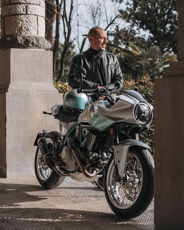 실버와 아쿠아 그린 조합은 두카티의 역사를 담았고, 여기에 750 이몰라 데스모 연료 탱크 스트립에서 영감받은 골드 라인이 더해져 상징성을 강조했다. 바엔드 미러가 적용된 클립온 핸들바, 짧고 날렵한 페어링, 간결한 테일 디자인은 카페 레이서의 정체성을 명확히 보여준다.