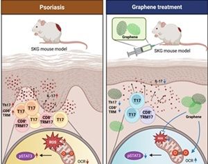 실험 결과, 나노그래핀옥사이드를 처리하자 건선 관련 면역세포에서 ▲증가해 있던 활성산소가 감소, ▲떨어져 있던 미토콘드리아 기능 회복, ▲과도하게 활성화된 STAT3(인산화 STAT3) 감소, ▲IL-17 분비 세포 수 감소 등의 변화가 나타났다.