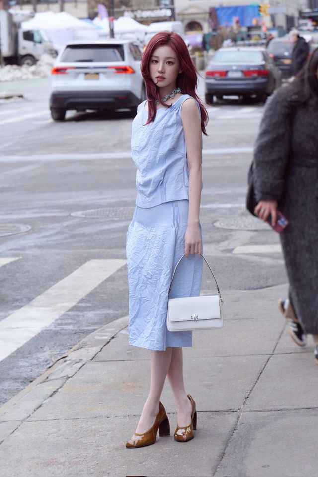 (여자)아이들의 우기가 뉴욕의 세련된 거리 풍경을 배경으로, 구겨진 듯한 텍스처가 돋보이는 스카이 블루 컬러의 투피스 셋업을 착용하여 독보적인 패션 감각과 도회적인 미모를 뽐냈습니다. 붉게 물든 와인빛 헤어와 대비되는 화사한 의상 컬러는 그녀의 흰 피부를 더욱 돋보이게 하며 화보의 한 장면 같은 분위기를 완성합니다.