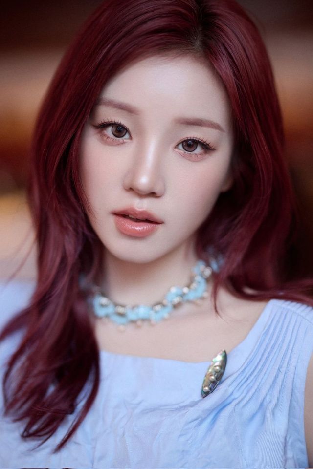 뷰티 연출은 강렬한 컬러 대비를 통해 시선을 사로잡습니다. 바람에 자연스럽게 흩날리는 와인 레드(Wine Red) 컬러의 롱 웨이브 헤어는 차분한 블루 톤 의상과 완벽한 보색 대비를 이루며 우기의 존재감을 부각합니다. 메이크업은 투명한 피부 표현 위에 눈매를 강조한 그윽한 브라운 음영과 누디한 오렌지 코랄 립을 더해, 성숙하면서도 시크한 가을 여신의 미모를 완성했습니다.