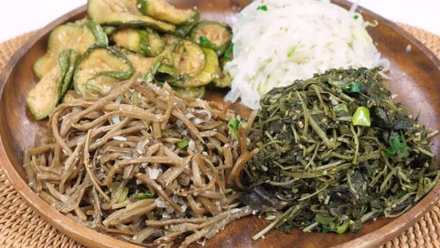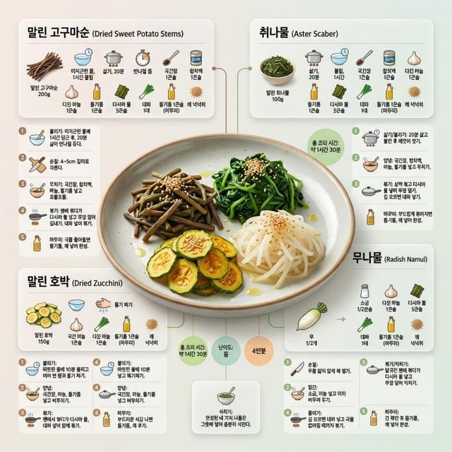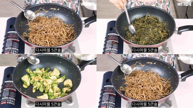 조리에 필요한 재료는 말린 고구마순, 취나물, 말린 호박, 무, 대파, 다시마 물이다. 해당 레시피의 '킥'이라고 할 수 있는 다시마 물은 물에 다시마 네 장을 넣고 우려내 준비한다. 나물의 풍미를 돋울 대파는 미리 썰어 두고, 통깨는 더 고소한 맛을 내기 위해 한 번 갈아서 사용한다.