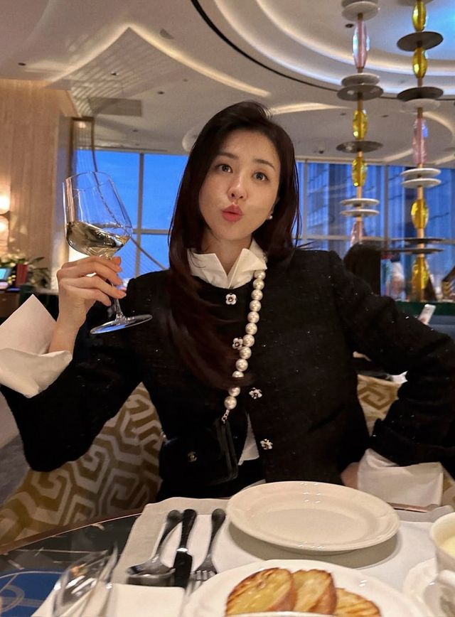 사진 속 박하선은 한 손에 와인잔을 들고 장난스러운 표정을 지은 채 카메라를 응시하고 있다. 그는 한쪽으로 가르마를 넘겨 성숙한 느낌을 자아냈으며, 그가 입은 트위드 재킷은 꽃 모양의 단추가 포인트로 고급스러우면서도 귀여운 분위기를 더한다.