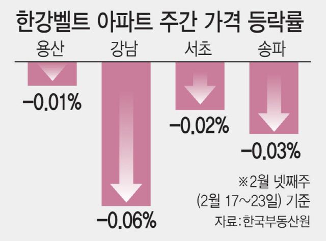 특히 강남3구와 용산구 아파트는 2년 만에 하락 전환했다. 강남구는 0.06%, 서초구는 0.02%, 송파구는 0.03%, 용산구는 0.01% 하락해 서울 25개 자치구 중 유일하게 하락세를 보였다. 송파구는 2024년 2월, 나머지 구는 2024년 3월 이후 첫 하락 전환이다. 지난 주 경기도의 ‘강남’으로 불리는 과천 아파트가 0.03% 하락해 2024년 5월 마지막 주(-0.07%) 이후 1년 9개월 만에 하락 전환한 이후 서울 핵심지로도 가격 하락세가 번지고 있는 것이다. 과천은 이번 주에도 0.10% 하락해 2주 연속 하락했다.