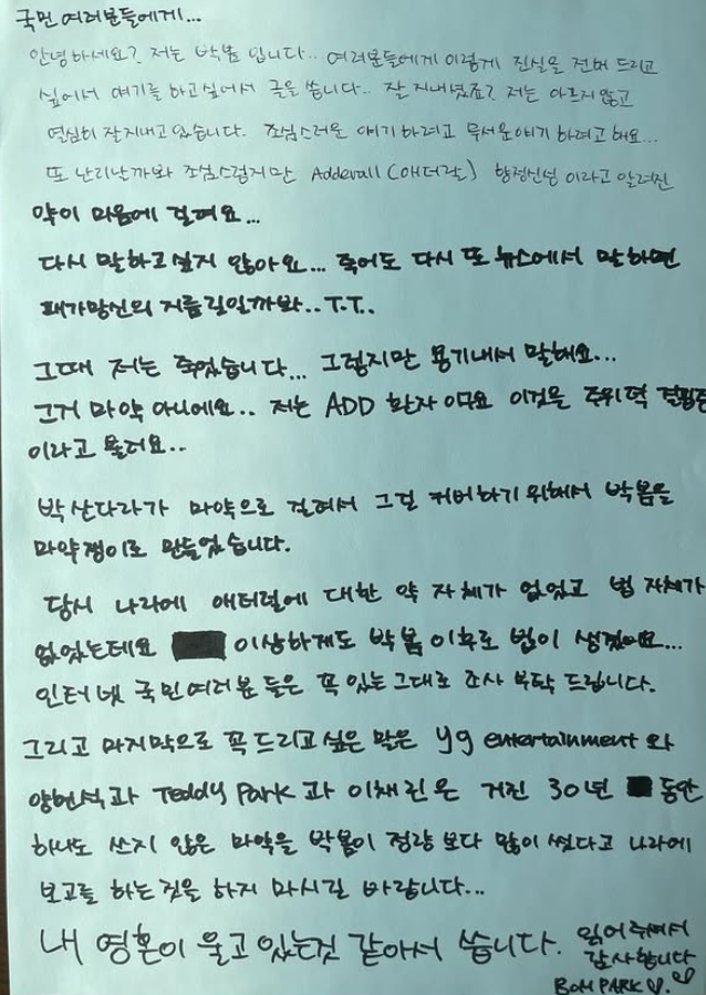박봄은 지난 3일 자신의 SNS에 자필로 쓴 글의 사진을 게재했다. 해당 글에서 박봄은 “조심스러운 얘기, 무서운 얘기 하려고 한다. 또 난리 날까봐 조심스럽지만 애더랄 향정신성이라고 알려진 약이 마음에 걸린다”며 “다시 말하고 싶지 않다. 죽어도 다시 또 뉴스에서 말하면 패가망신의 지름길 일까봐”라고 밝혔다.