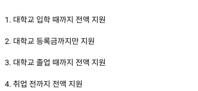 - 대학 등록금 지원: 생활비를 제외한 학비만을 보조해 주는 절충안으로, 자녀가 학업에 전념할 수 있는 최소한의 기반을 마련해 주겠다는 의지가 담겨 있습니다.
