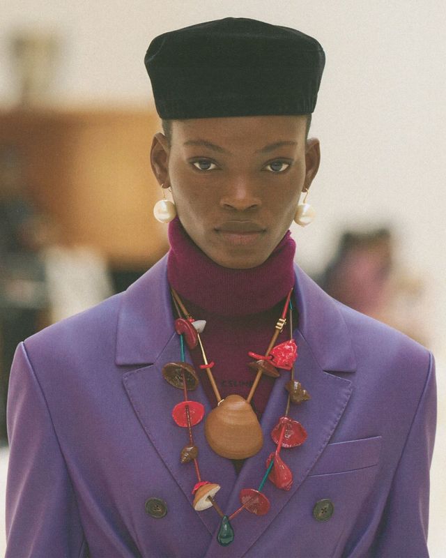 가령 잘 재단된 테일러드 재킷 위에 정리가 덜 된 듯 삐죽 튀어나온 스트라이프 셔츠, 혹은 보색의 대비를 이루는 색 조합, 여행지에서 샀을 법한 장식적인 목걸이를 보라색 재킷 위에 툭 걸친 스타일링 같은 것들 말입니다. 기분에 따라 걸친 듯한데 묘하게 어울립니다. 그 안에는 직관적인 감각과 스타일링에 대한 진심이 자연스럽게 스며 있습니다.