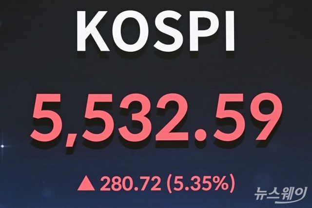 10일 한국거래소에 따르면 코스피 지수는 전 거래일(5251.87) 대비 5.35%(280.72포인트) 오른 5532.59에 거래를 마쳤다.