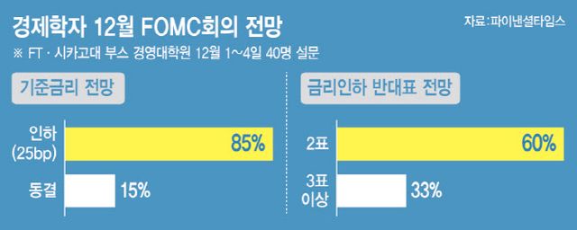 이번 설문조사에서 12명이 만장일치로 12월 FOMC에서 금리 인하를 지지할 것이라고 답한 이는 1명에 불과했다. 응답자의 60%가 2명의 반대표를 예상했고, 33%는 3명 이상의 반대 의견이 나올 것이라고 내다봤다. FT에 따르면 FOMC에서 반대표가 3명 이상이 나온 것은 1992년이 마지막이었다.