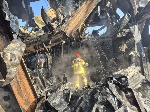 현장은 폭탄을 맞은 듯 처참한 모습이다. 불에 녹아내린 외장 패널이 너덜너덜하게 매달려 있고, 주저앉은 지붕 사이로 시커멓게 그을린 내부가 훤히 들여다보인다. 건물 구조상 소방 용수가 닿지 않는 사각지대가 많아 소방대원들은 포크레인 등 중장비를 동원해 원자재와 잔해를 일일이 걷어내며 잔불을 정리하고 있다.