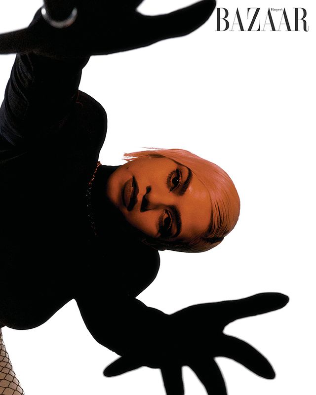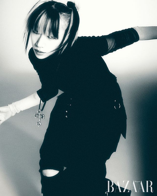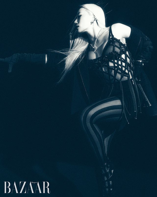 브라 톱, 재킷은 Dries Van Noten. 데님 슬립은 Chika Kisada by Adekuver. 스커트는 Muaga. 귀고리는 Mugler x Hamp;M. 목걸이는 Chrome Hearts. 장갑은 Dolce amp; Gabbana. 팔찌는 Code Off. 스타킹은 Shop Cider. 슈즈는 Gianvito Rossi.