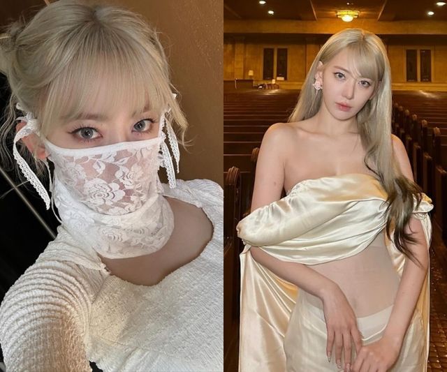 공개된 사진 속 사쿠라는 화이트 티셔츠에 양갈래 올림 머리를 하고 레이스 마스크로 포인트를 주는가 하면, 나비 장식 크롭톱을 입고 알록달록한 그라데이션 선글라스를 머리에 걸친 채 키치한 매력을 선보였다.