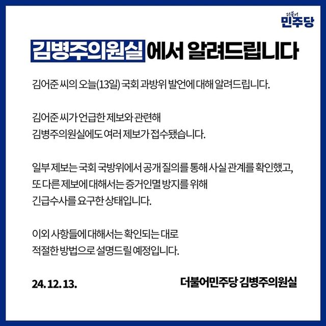 이어 "미군 몇 명을 사살해 미국으로 하여금 북한 폭격을 유도한다 등의 (제보가) 더 있다. 그 담당 부대는 김병주 의원 또는 박선원 민주당 의원에 문의하길 바란다"라고 말했다.