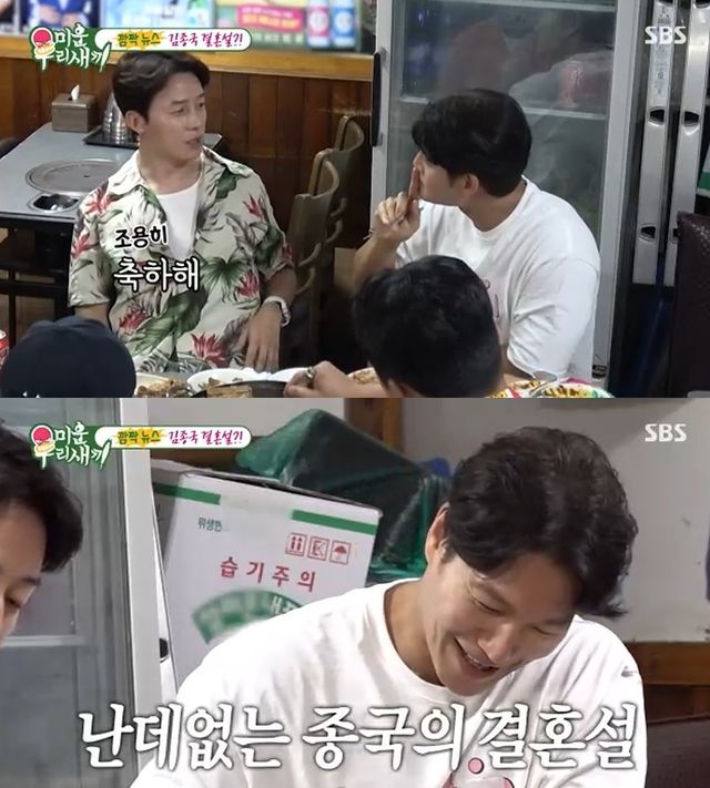 허경환은 "결혼 축하드린다"는 말을 건넸고, 김종국은 "하지마. 몰아가기 하지마"라고 이야기했다.