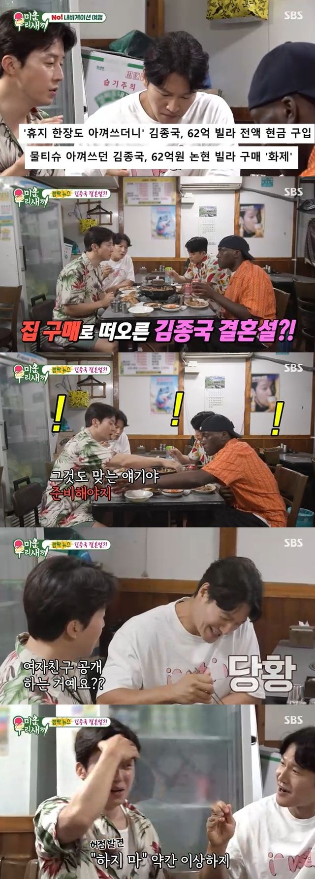 이에 허경환은 "지금 여자친구 공개하는거냐"고 당황했고, 더 당황한 김종국은 "그건 아니지만 준비를 해야 결혼을 하는 거 아니냐"라고 답했다.