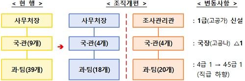 이번 조직개편을 통해 現 사무처 조직을 조사부서와 정책부서로 완벽히 이원화하고, 사무처장은 정책기능, 조사관리관(신설)은 조사기능을 각각 전담·관리해 각 기능별 전문성·책임성을 강화한다는 계획이다.