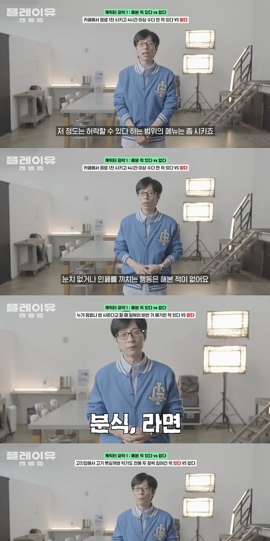 이날 유재석은 '해본 적 있다 vs 없다'를 진행했다. 유재석은 '카페에서 음료 1잔 시키고 4시간 이상 수다 떤 적'에 대해 "그런 적 있다. 우리가 어느 정도 사장님이 이 정도면 허락할 수 있다 정도의 메뉴를 시킨다"고 이야기했다.