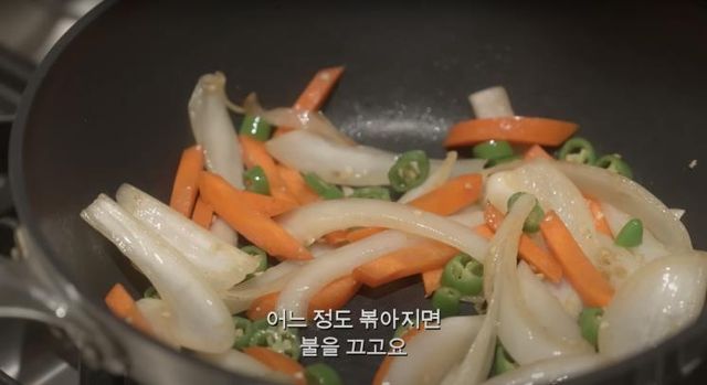 2. 가열한 팬 위에 버터 10g과 채 썬 양파와 당근, 청양고추를 차례로 넣어 볶아준 다음 불을 끕니다.