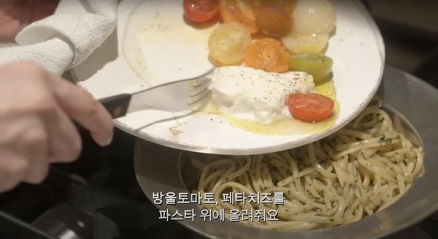 4. 파스타면 위에 구운 페타치즈와 방울토마토 잘 올려준 다음 후추를 뿌려 마무리하면 초간단 ‘페타치즈 파스타’ 완성입니다.