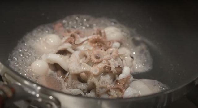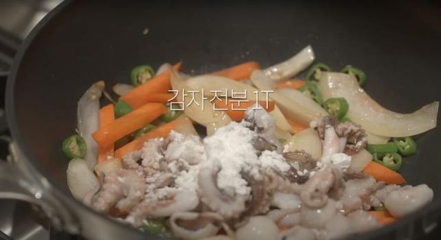 3. 재료의 열기가 살짝 식으면 주꾸미와 감자전분 한 스푼을 넣고 잘 섞어주세요.