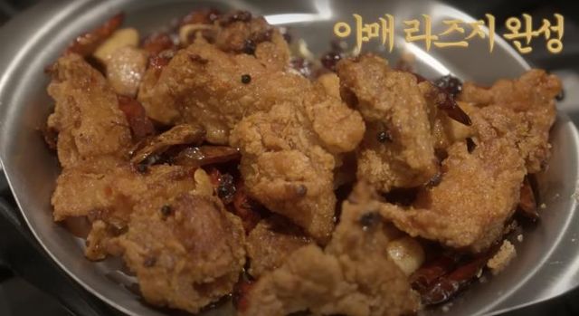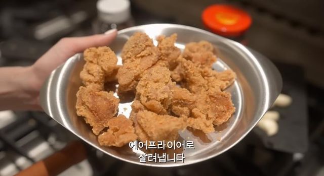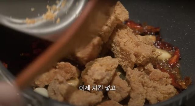 4. 두반장 한 스푼과 1번의 치킨을 넣고 잘 섞어주세요.
