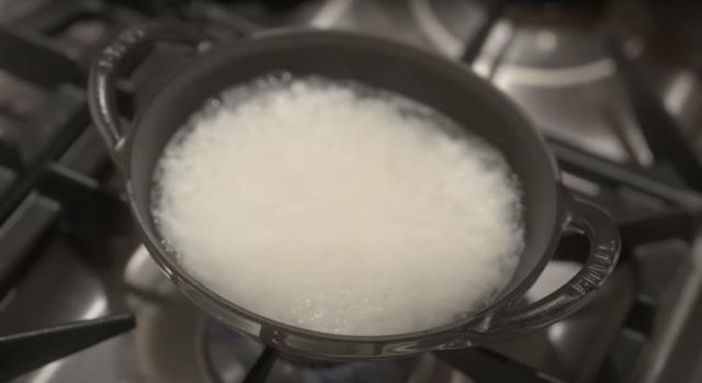 2. 냄비에 쌀 140g과 물 140ml를 넣고 3분간 팔팔 끓여요.