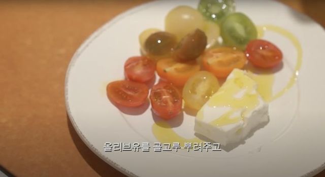 2. 페타치즈 1/4과 먹기 좋게 손질한 방울토마토 위에 올리브유와 후추를 골고루 뿌려준 후 240도로 예열한 오븐에 넣어 6분동안 구워줍니다.