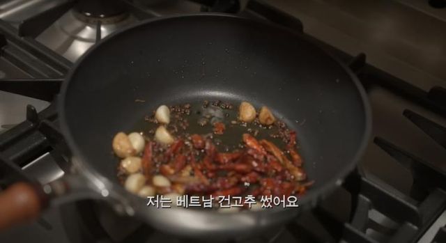 3. 마늘이 익으면 산초와 건고추를 넣고 다시 한번 볶아줍니다.