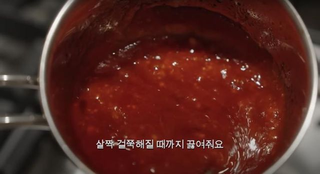 2. 냄비에 설탕과 고추장, 고추기름, 식용유, 케첩, 다진 마늘을 한 스푼, 물엿 세 스푼, 약간의 소주와 청양 고춧가루를 넣은 뒤 잘 저어가며 걸쭉해질 때까지 끓여주세요.