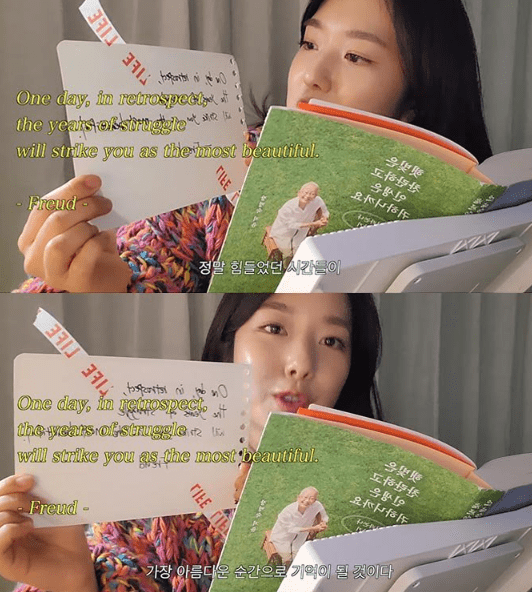그러면서 "영어로 쓰여 있는데 해석을 하자면 ‘언젠가 회상을 해보면 정말 힘들었던 시간들이 가장 아름다운 순간으로 기억이 될 것이다’는 뜻이다. 프로이트가 한 말이다. 너무 비슷하다"라고 되새겼습니다.
