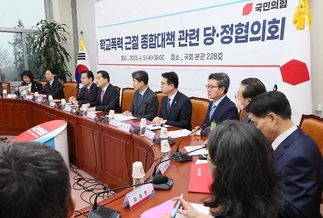 5日上午,国民力量党议员在国会举行校园暴力综合对策党政会议。【图片提供 韩联社】