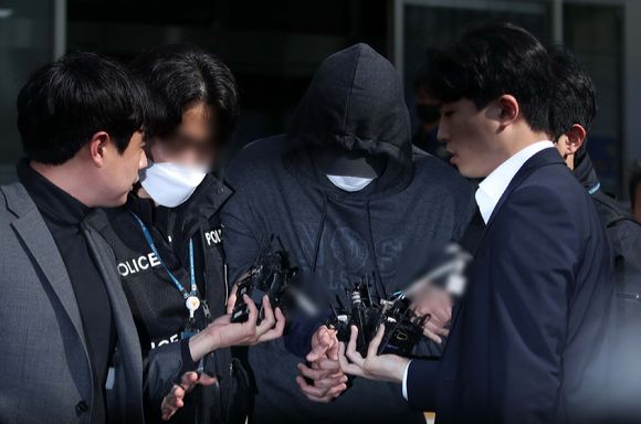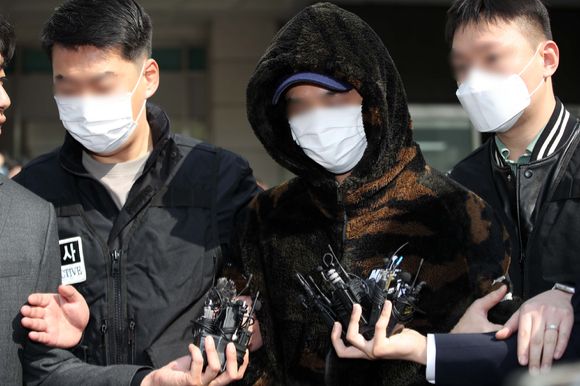 서울 강남에서 40대 여성을 납치해 살해한 사건의 용의자 3인조 중 한 명이 구속 전 피의자 심문(영장실질심사)에 출석하기 위해 3일 오전 서울 수서경찰서에서 서울중앙지법으로 이동하고 있다. [사진=뉴시스]