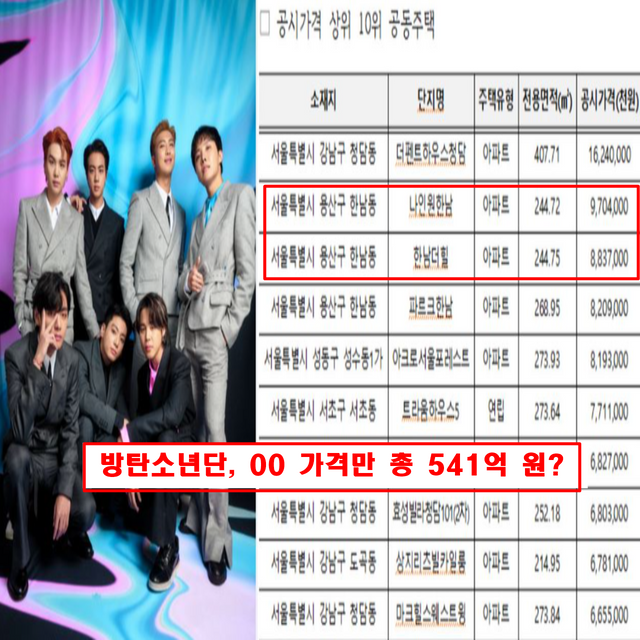 앞서 지민은 건강보험료 체납으로 지난해 현금 59억 원으로 매입한 고급 아파트 '나인원한남'을 압류당했다.