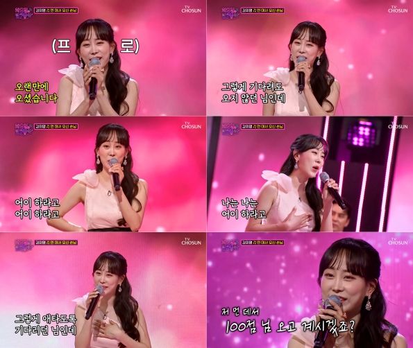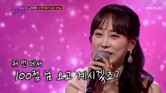 이날 김의영은 고정우의 상대로 나면서 '먼 데서 오신 손님'을 선곡하고 역대급 무대로 흥 폭탄을 터트렸다. 만개한 벚꽃이 떠오르는 연분홍빛의 드레스 차림으로 무대에 올른 김의영은 '먼 데서 오신 손님'을 열창, 보는 이들에게 귀 호강을 선사했다.
