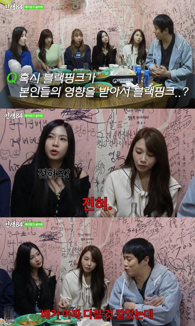 첫 번째 질문은 "혹시 블랙핑크가 에이핑크의 영항을 받아서 '블랙핑크'라고 생각하는가?"였다. 여유롭게 "전혀"라고 넘기는 에이핑크와 달리 기안84는 손을 벌벌 떨어 웃음을 안겼다.