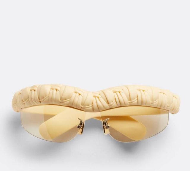 보테가베네타 하우스의 아이덴티티, 위빙 디테일이 특징인 이 선글라스는 눈을 측면부터 감싸주는 스포티한 무드의 고글형 디자인으로 자외선 차단에도 단연 제격이다.