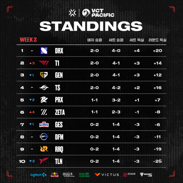 T1과 젠지는 개막주 차부터 2주 차 경기까지 모두 승리하면서 한국 팀의 선전에 일조했다. T1은 2승 0패 라운드 득실 +14로 2위에 올랐고, 젠지도 같은 2승 0패이지만 라운드 득실(+12)에서 밀리며 3위에 위치했다.