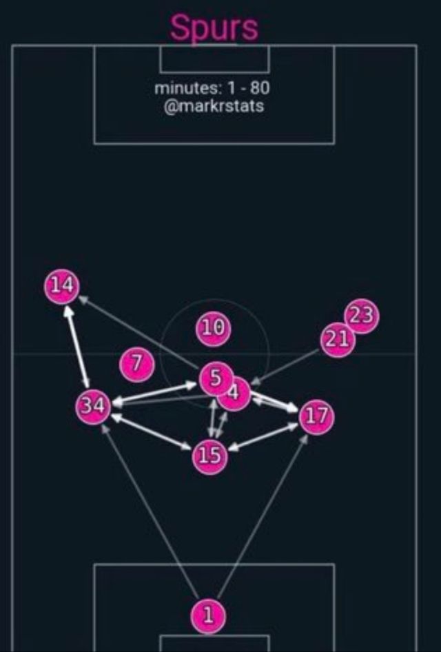 축구통계사이트 '마크 스태츠'는 5일 그림 하나를 올렸다. 지난 4일 열린 잉글리시 프리미어리그 에버턴-토트넘 맞대결에서 토트넘 선수들의 전반 0분~후반 35분까지 패스맵이다.