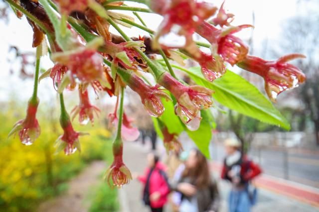 전국적으로 비가 내린 5일 오후 서울 여의도 윤중로, 잎이 떨어진 벚꽃 수술에 빗방울이 맺혀 있다.[사진=연합뉴스]