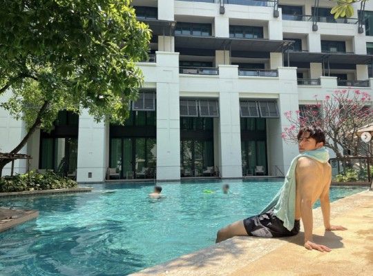 공개된 사진에는 호텔 수영장에서 휴식을 즐기는 차은우의 모습이 담겼다. 근육질 몸매가 눈길을 끈다.