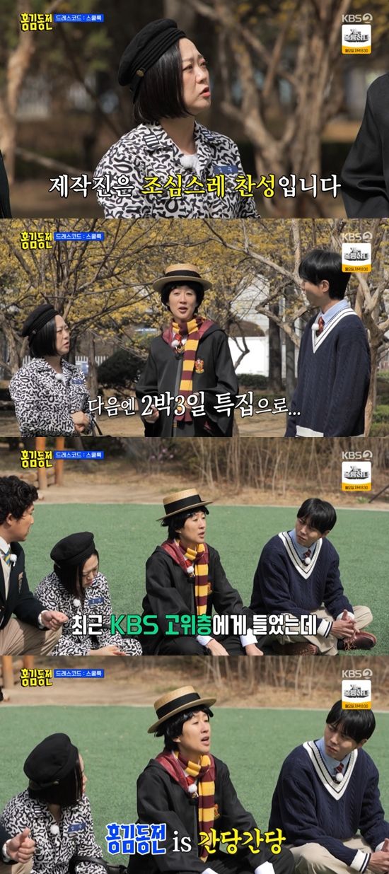 막간 '홍김동전' 위기설도 불거졌다. 홍진경은 "얼마 전 예능 관계자를 만났다. 그분이 나에게 무서운 이야기를 했다. KBS 윗분 이야기를 들었는데 우리가 간당간당하다고 하더라"며 폐지 위기에 근심 가득한 표정을 지었다. 이어 "우리 매일 마지막 방송이라는 생각으로 열심히 하자"며 의욕을 불태워 훈훈함을 자아냈다.