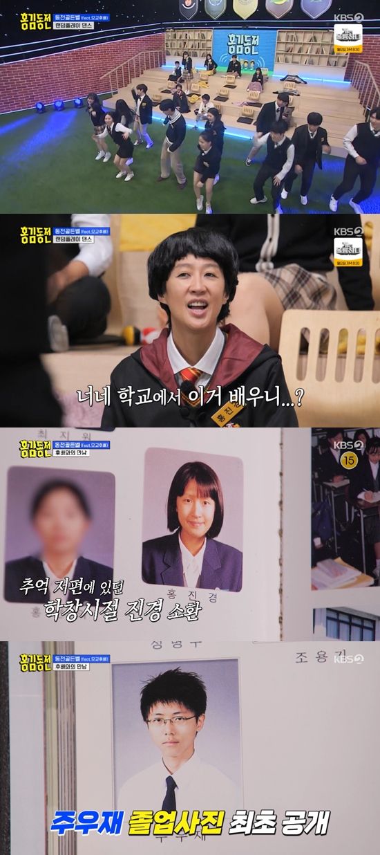 또 홍진경은 후배들이 들고 온 졸업앨범을 보고 "나 졸업앨범이 없다. 처음 본다"며 깜짝 놀라 했다. 김숙은 청초한 미모의 사진 속 홍진경에 "진경이 진짜 이쁘다"며 감탄했다. 주우재의 후배들 역시 졸업사진을 들고나왔다. 마치 박사님처럼 나온 졸업사진에 학생들은 "지리 선생님 아니냐"며 웃었고, 주우재는 "얼굴이 다를 수밖에 없다. 그때 안경이 마이너스 9, 10이었다"며 바쁘게 해명했다.