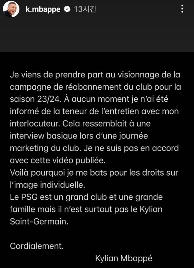 홍보 영상 때문에 논란이 생기자 결국 음바페가 직접 진압에 나섰다. 그는 개인 SNS를 통해 “나는 2023-24시즌 구단 재구독 캠페인에만 참여했을 뿐이다. 인터뷰 내용에 대해서는 한 번도 알려주지 않았다. 구단 마케팅데이의 기본적인 인터뷰처럼 보였다. 게시된 영상에 동의하지 않는다. PSG는 빅클럽이고 큰 가족이지만 절대로 킬리안 생제르맹이 아니다”라며 구단의 홍보 영상에 분노했다.