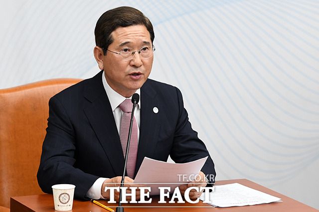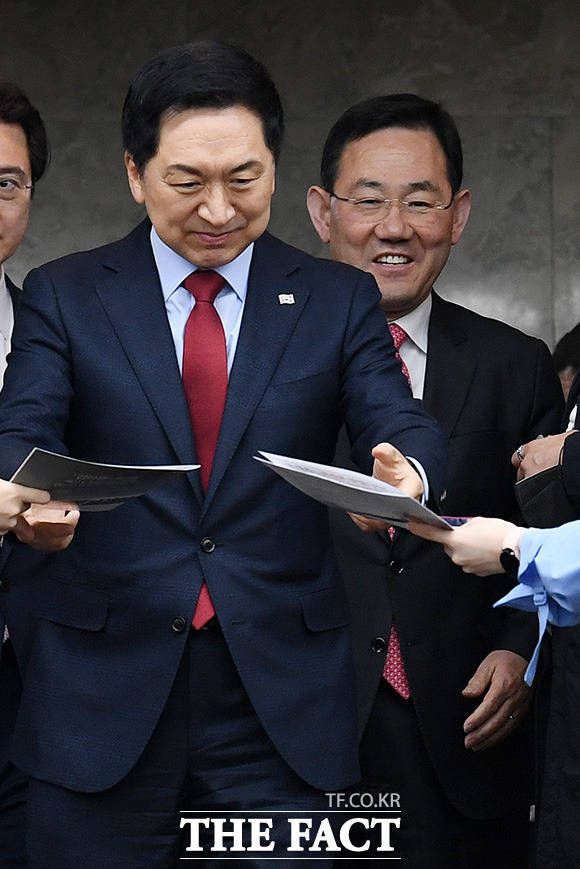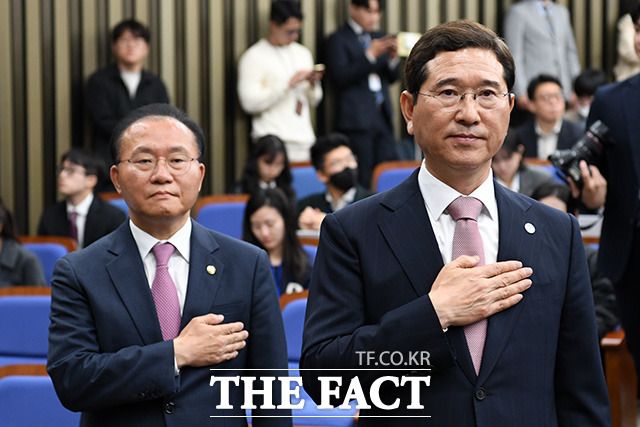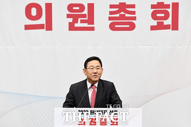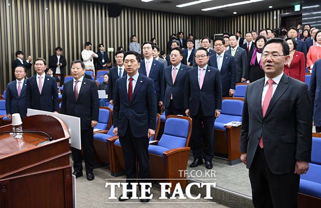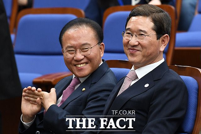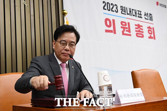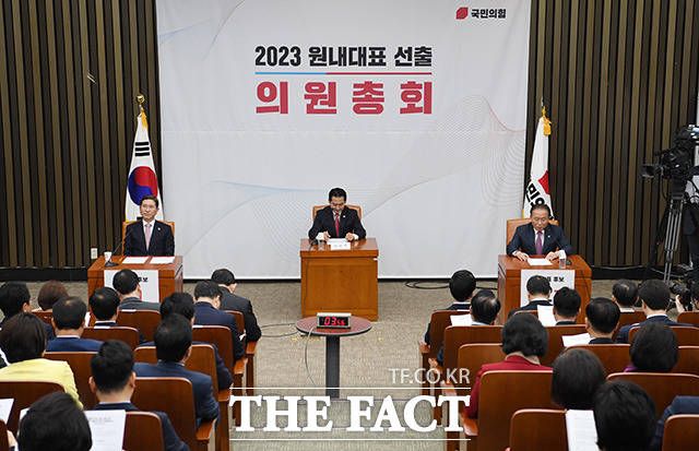 [더팩트ㅣ국회=남용희 기자] 국민의힘 원내대표 선거에 출마한 윤재옥 의원과 김학용 의원이 7일 오전 서울 여의도 국회에서 열린 국민의힘 원내대표 선출을 위한 의원총회에 참석해 김기현 대표의 발언을 듣고 있다.